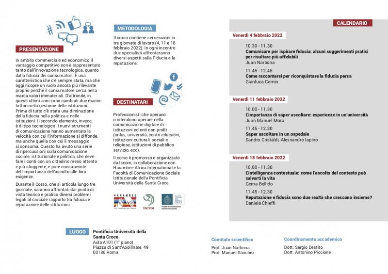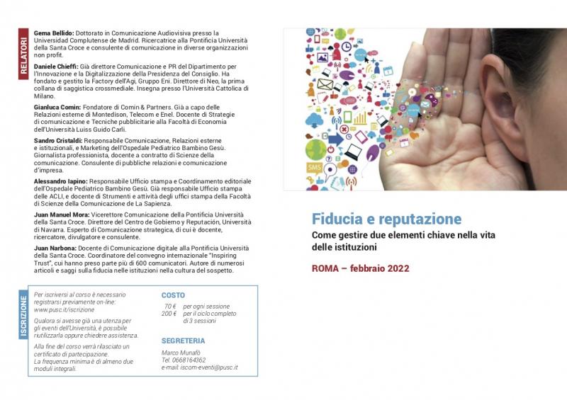 Il corso contiene sei sessioni in tre giornate di lavoro (4, 11 e 18 febbraio 2022). In ogni incontro due specialisti affronteranno diversi aspetti sulla fiducia e la reputazione.