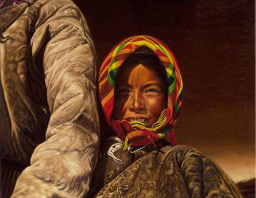 La seconda opera (del 2013), intitolata “The Cradling Arm” è, se possibile, ancora più incisiva nel suo richiamo all’abbraccio non solo tra la madre e la figlia rappresentate, ma soprattutto a quell’abbraccio che la madre terra, nel suo sfondo di distese e promontori, riserva all’umanità generando vita. Questo è un concetto che si ricollega perfettamente a quanto espresso dal Santo Padre nell’enciclica “Laudato si’”: così, da un lato, l’artista Zhang evidenzia il legame, oggi particolarmente delicato, tra l’uomo e la natura da cui dipendiamo, facendo emergere nello sguardo della ragazza ritratta un sentimento di purezza insieme determinata e pacifica; esso ben si fonde con la vitalità creata dalla natura che, sullo sfondo (protendendosi all’infinito), collega il cielo alla terra, e rende manifesta la straordinaria potenza della religione. Dall’altro lato, il Papa ha ben chiarito nell’enciclica predetta che la natura è proprio “la nostra casa comune […], ed è anche come una sorella, con la quale condividiamo l’esistenza, e come una madre bella che ci accoglie tra le sue braccia” (paragrafo 1 delle Premesse all’Enciclica). L’autentico sviluppo umano possiede un carattere morale e presuppone il pieno rispetto della persona umana, ma deve prestare attenzione anche al mondo naturale, poiché come sostenuto anche dal suo predecessore Papa Benedetto “l’uomo non è soltanto una libertà che si crea da sé. L’uomo non crea se stesso. Egli è spirito e volontà, ma è anche natura” (paragrafo 6 delle Premesse).